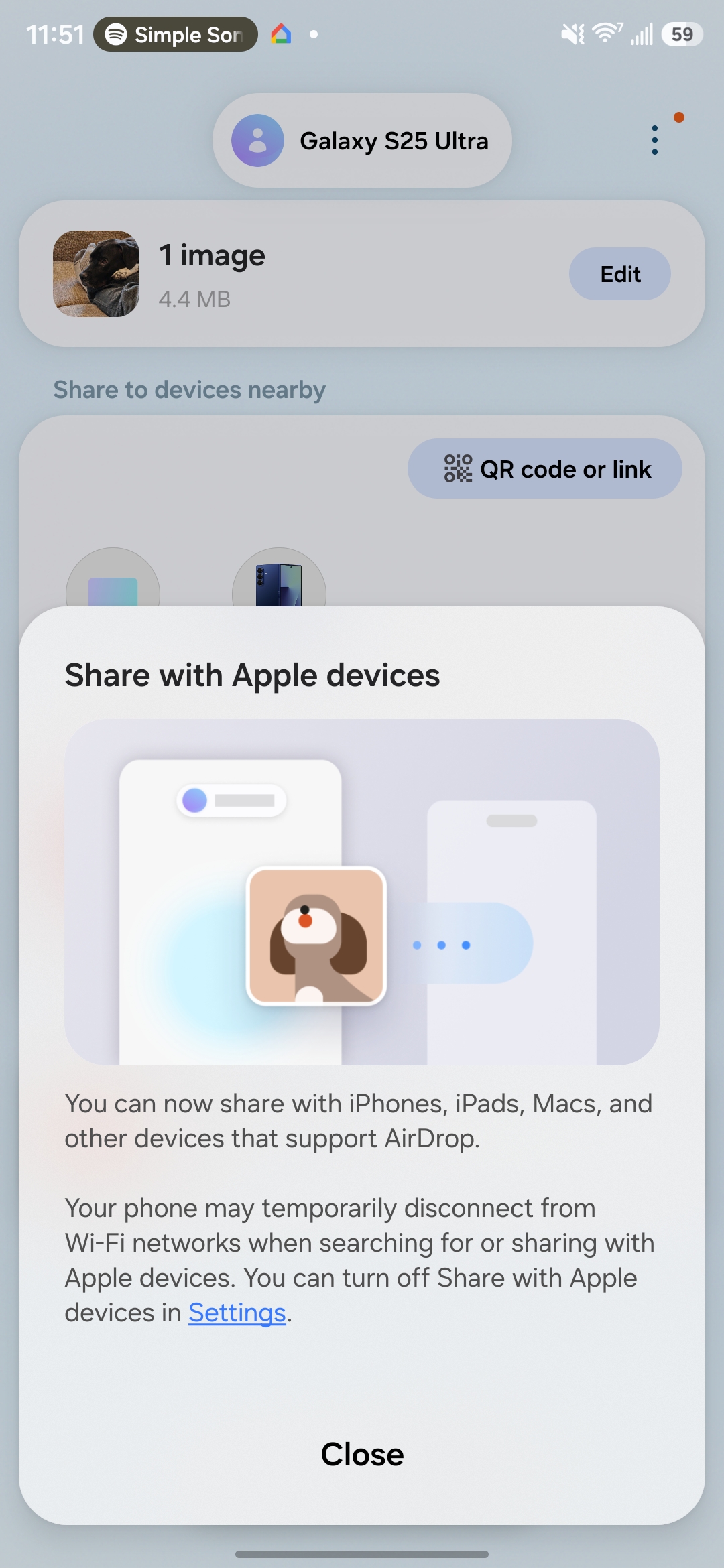 On the two devices we got this “Sharing with Apple devices” menu to appear in Quick Share, AirDrop doesn’t actually work between the Samsung Galaxy S25 Ultra and Galaxy Z Fold 7 we tested. Neither device was visible to an iPhone 15 Pro or a MacBook Air, nor were those Apple devices showing up for our Galaxy devices. Meanwhile, a Pixel 10 and a Galaxy S26 Ultra nearby were both able to show up to the Apple devices.