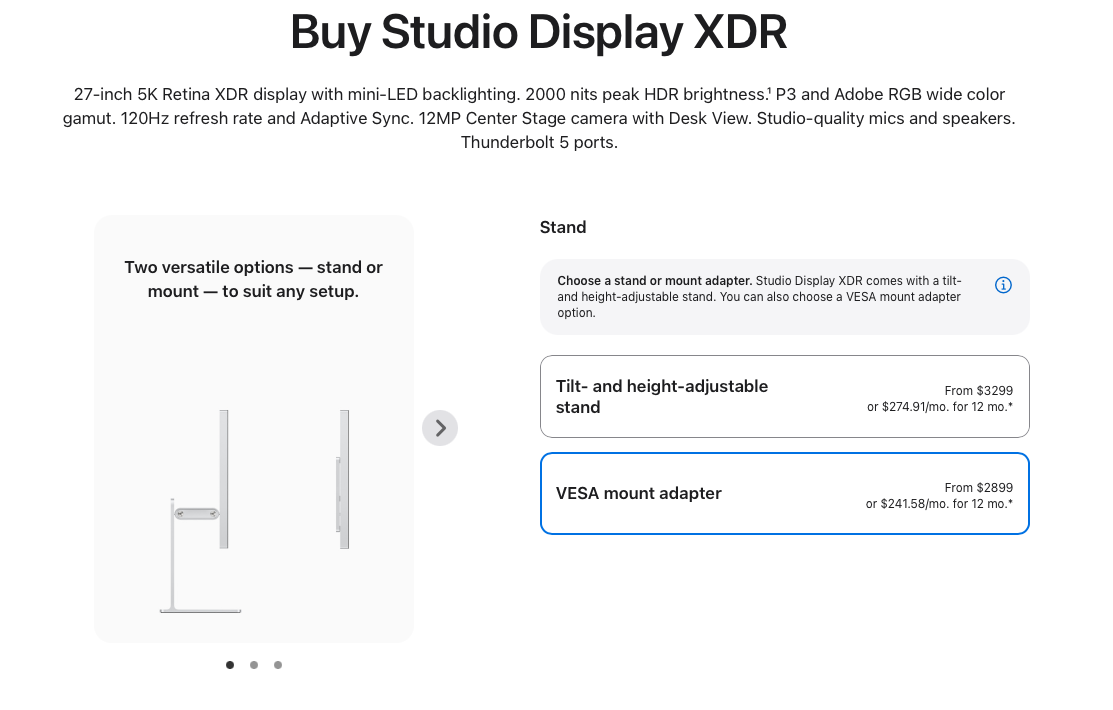 The company has quietly updated the pricing to make the VESA mount option $400 cheaper, so the entry price for the display is now $2899. The Studio Display XDR with stand still starts at $3299.