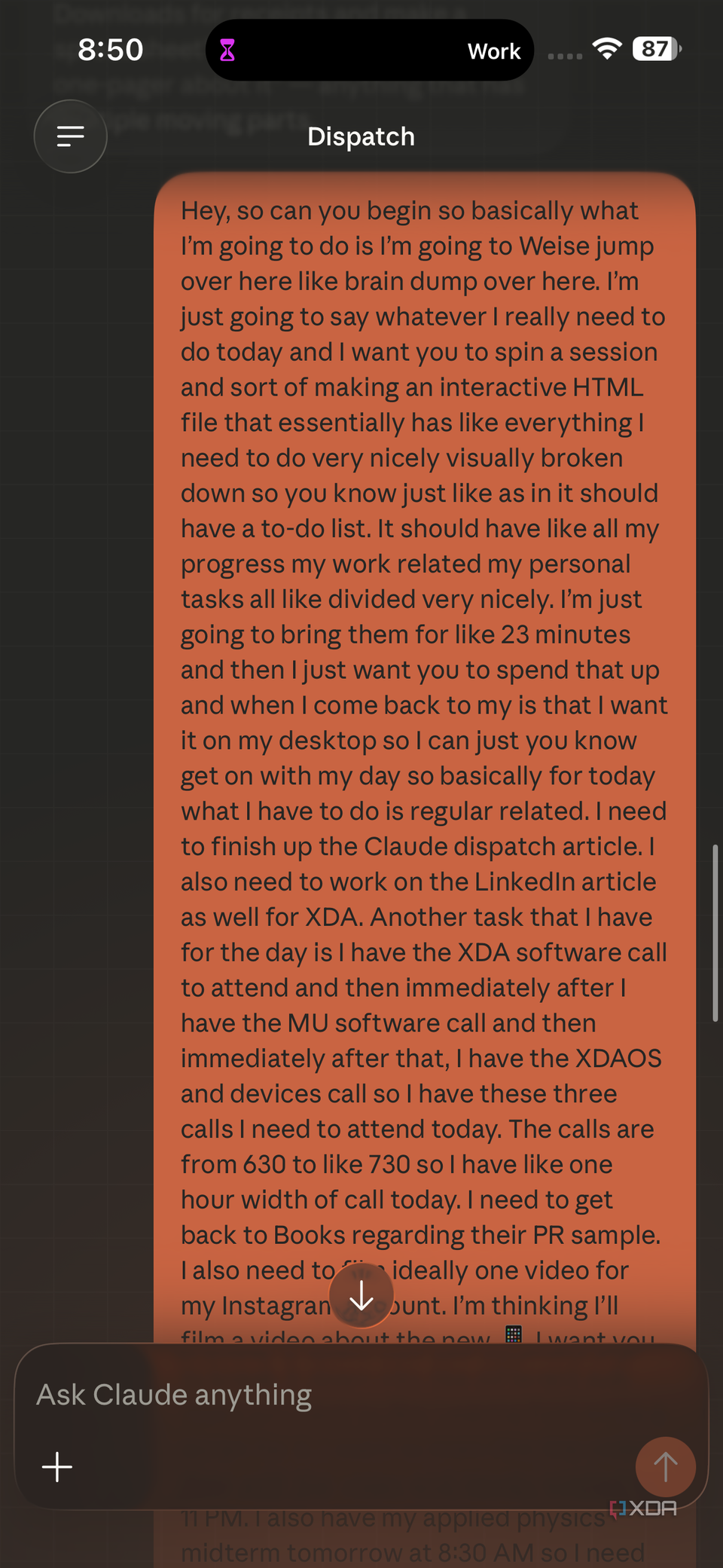 A few days ago, I wrote about how I’ve been using Claude Code’s Voice mode to essentially brain-dump everything I need to do for the day, and then asking it to convert it into an interactive HTML webpage that functions as a to-do list. It’s been working incredibly well, and it’s become an integral part of my morning routine. But there was a slight problem with the setup: I’d need to open my laptop first thing in the morning, head to the Terminal, type claude and only then could I begin. To make this easier, I made sure to have a Terminal window with Claude set up the night before so I’d only need to open my laptop and start talking. But with Dispatch, I don’t even need to do that. I can brain-dump my tasks from my phone while I’m still in bed, and by the time I sit down at my desk, the to-do list is already built and waiting for me on my desktop!