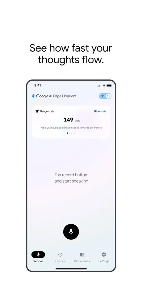 Google AI Edge Eloquent lets you “turn raw messy speech into well crafted text.” As you start talking, you see a real-time transcription and waveform with the ability to pause.