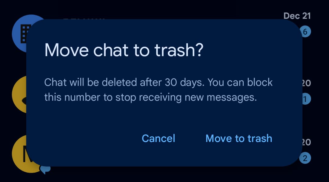 After tapping the “Trash” icon, Google Messages will explain the new behavior: “Chat will be deleted after 30 days.”