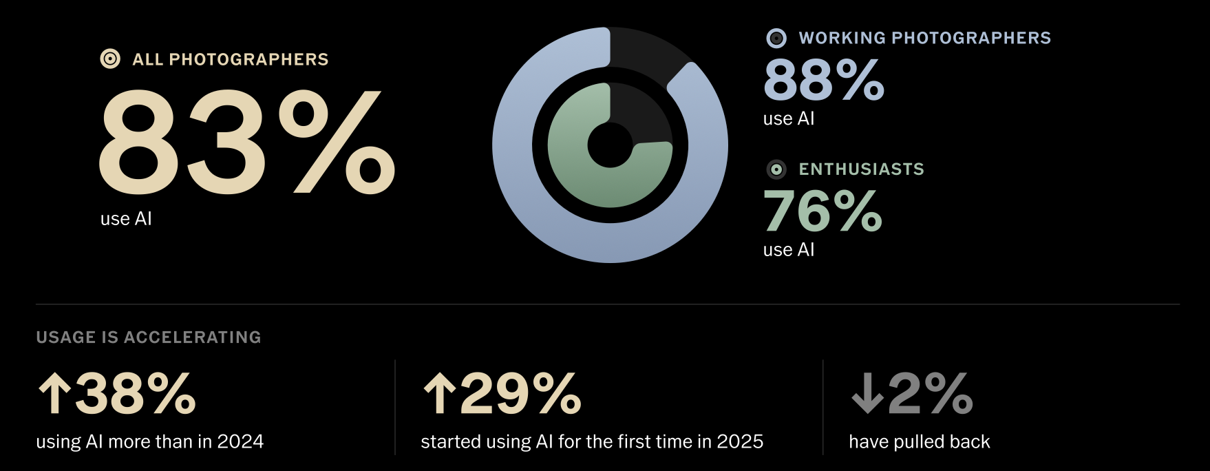 according to the data VSCO, 68% of working photographers use AI weekly or daily, compared to 34% of enthusiasts. Overall adoption, however, is much higher, reaching 83% across all photographers, including 76% of enthusiasts.