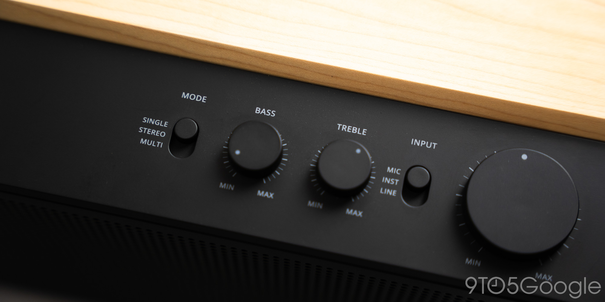 Riddled along the top are knobs and buttons that really nail down the “amp” feel. General Bluetooth controls are on the left, and the right carries a lot of the extras. That includes tone dials for bass and treble, and input selection.