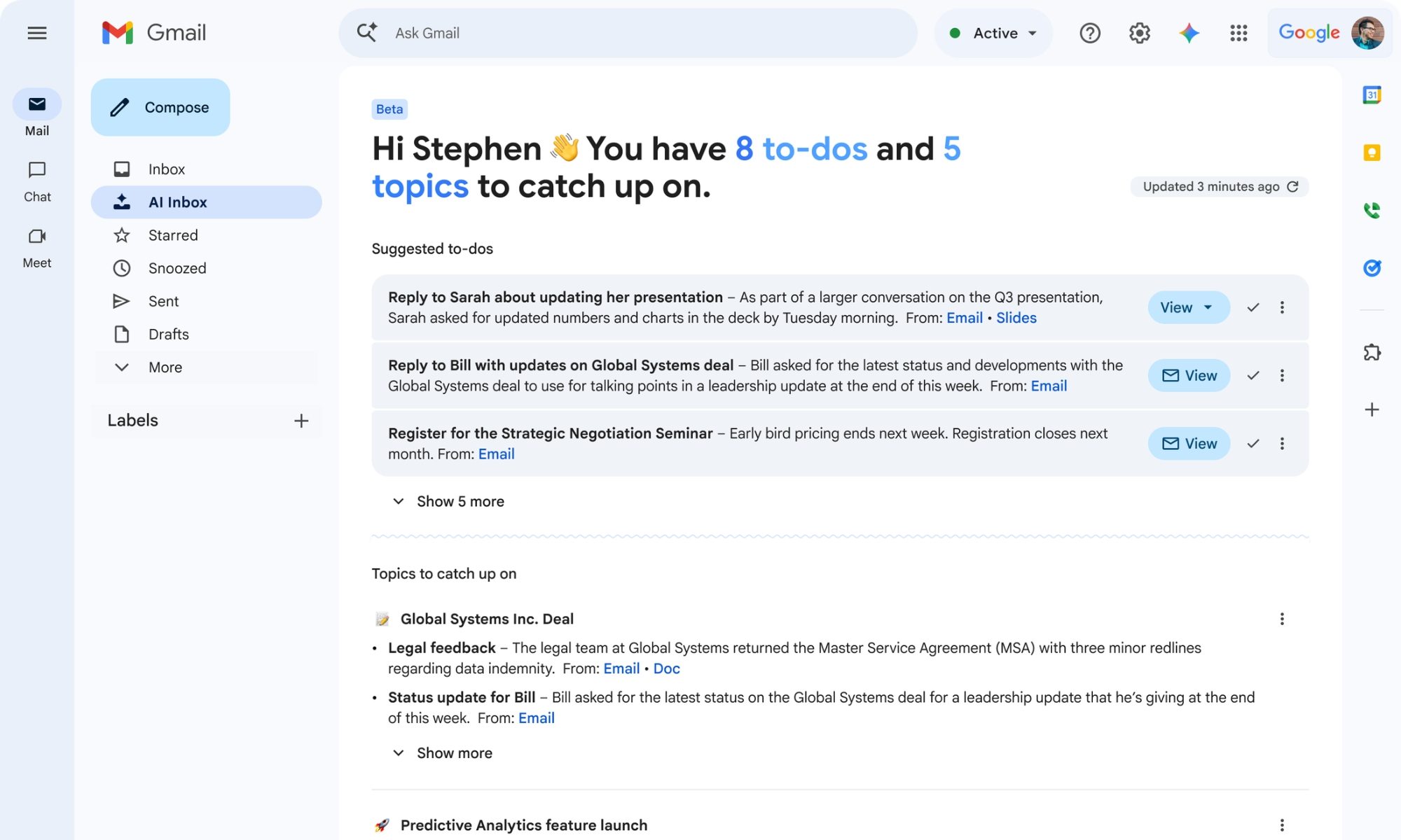 AI Inbox and AI Overviews in Gmail are also a part of the Workspace Intelligence package. The former turns your Gmail inbox into a task-based overflow, letting you quickly catch up on conversations and the work at hand. The latter creates a brief summary of the email conversations, similar to AI Overviews for Google Search.