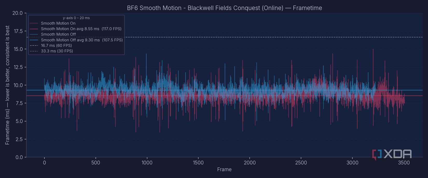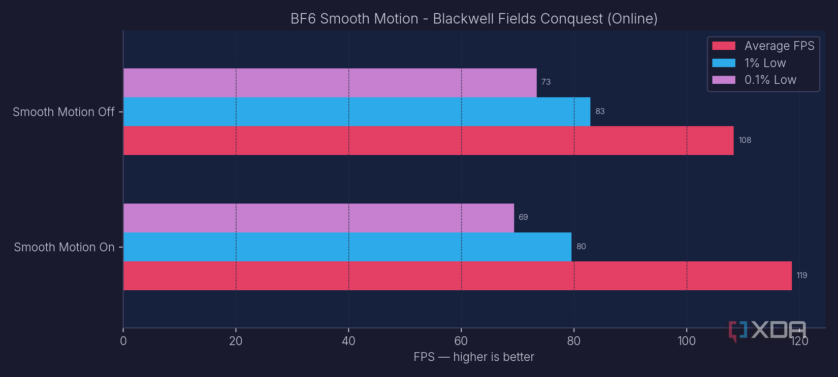 Battlefield 6 didn’t provide the same experience when I tested Smooth Motion in an online conquest game. It did increase my framerate by a bit, and was mostly harmless in regard to the visual quality of the game at 4K, but it didn’t provide anywhere near the same performance boost that we saw in Escape From Tarkov.