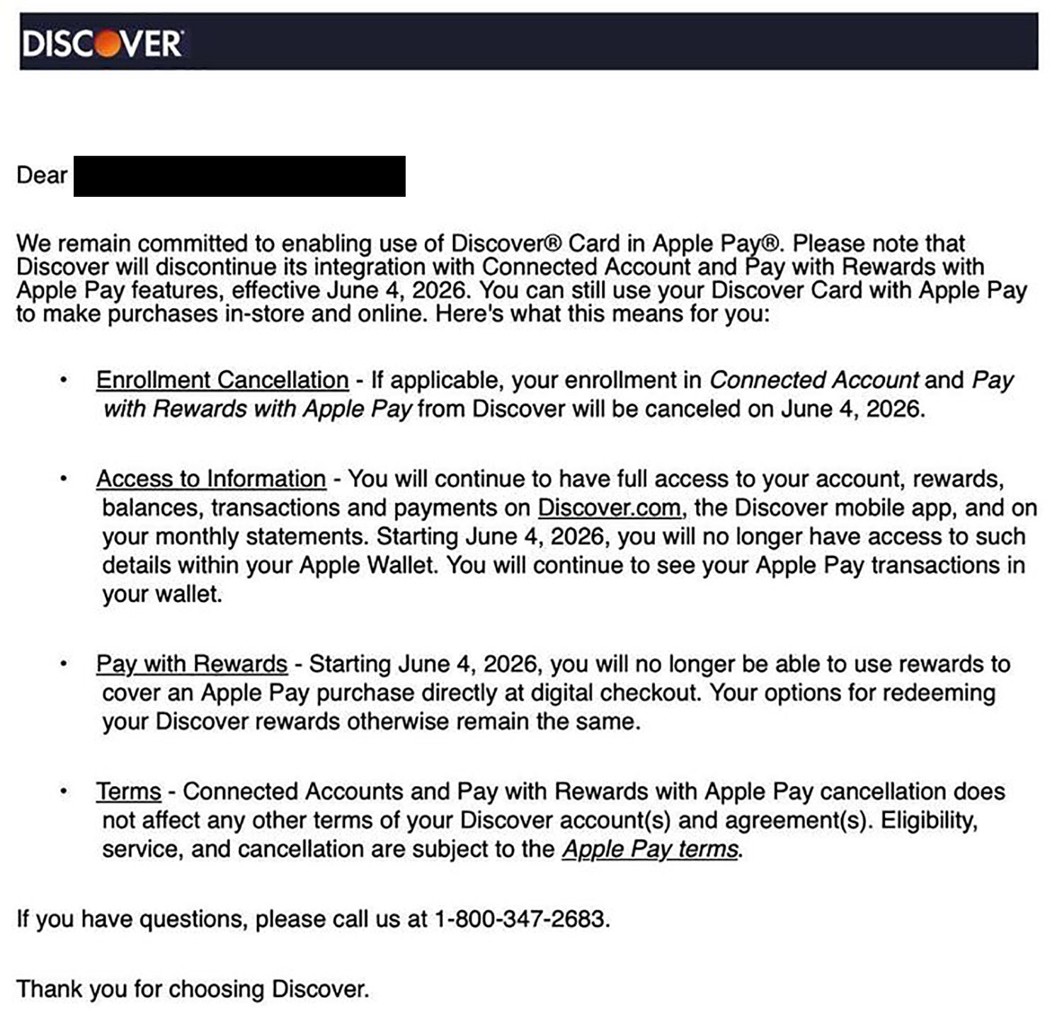 In the email sent to cardholders, Discover says that the enrollment cancellation in Connected Account and Pay with Rewards with Apple Pay will be automatic, and that this cancellation “does not affect other terms of your Discover account(s) and agreement(s).”