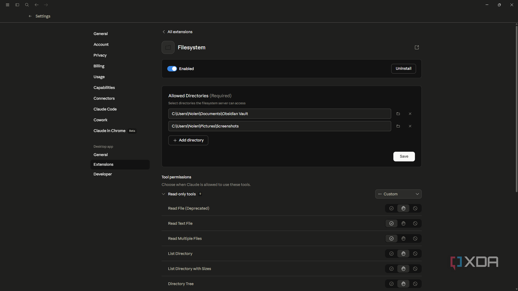 Setting it up took maybe three clicks. In Claude Desktop, you go into Settings, navigate to the Connectors, and the Filesystem extension is right there – you install it, point it at any folder paths on your PC, and that’s literally the whole process. I also recommend going through the permissions list if there’s anything you’d rather not grant access for, or would rather grant access now than have to confirm in the chat every time Claude asks.